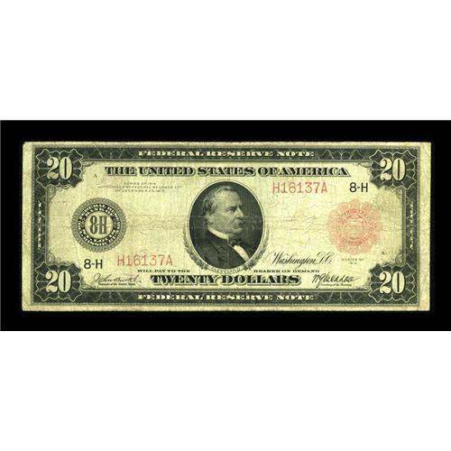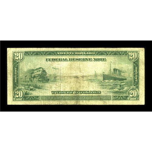 <B>Fr. 959a $20 1914 Red Seal Federal Reserve Note Very Good-Fine.</B></I> We see on the average about one of this Friedberg number per year. The Treasury Seal has faded some on this example.<BR><BR><b>Shipping:</b> Coins & Currency (<a target="_blank" href="http://www.heritageauctions.com/common/shipping.php">view shipping information</a>)