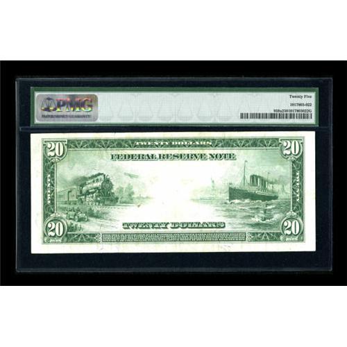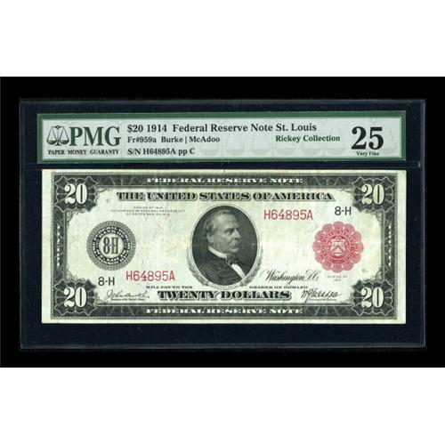 <B>Fr. 959a $20 1914 Red Seal Federal Reserve Note PMG Very Fine 25.</B></I> Just about two dozen examples of this St. Louis $20 are known. Five years have passed since the last example finer than VF was sold at public auction. This piece retains a bold overprint and deeply printed devices.<BR><BR><b>Shipping:</b> Coins & Currency (<a target="_blank" href="http://www.heritageauctions.com/common/shipping.php">view shipping information</a>)