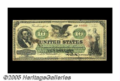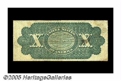 <B>Fr. 95a $10 1863 Legal Tender Fine.</B></I> An evenly circulated example of this tough type. A dark brown stain is noted at the right of the portrait area and will likely affect the final realization.
