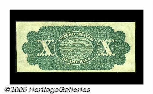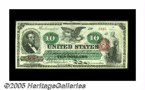 <B>Fr. 95b $10 1863 Legal Tender Choice New.</B></I> This is by far, the single best face margins we have ever seen on this type and the appearance of a Superb Gem in every respect. The note has had a single short split in the top margin professionally restored and it is extremely difficult to locate. The note is inexplicably graded EF in the Gengerke Census which was likely a net grade give by someone years ago when the split was still open. The surfaces of this piece are strictly original and it is now and always was a fully uncirculated piece.