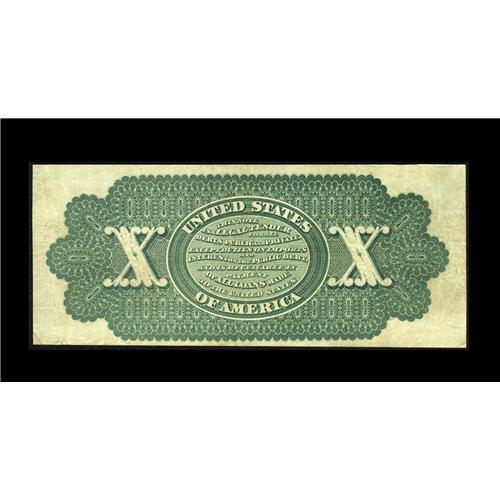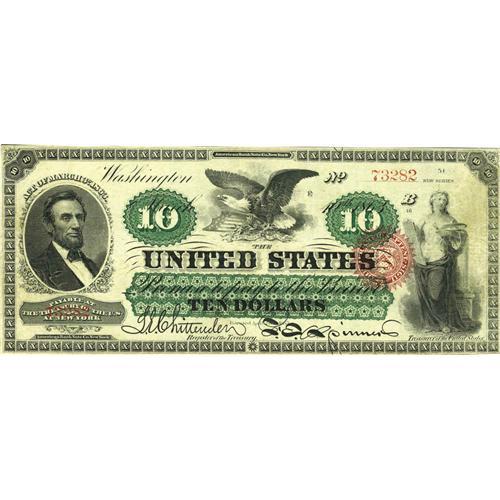<B>Fr. 95b $10 1863 Legal Tender Fine-Very Fine.</B></I> This Second Obligation note has great eye appeal with some flatness noticed. The brightness of the paper certainly enhances its overall appearance.