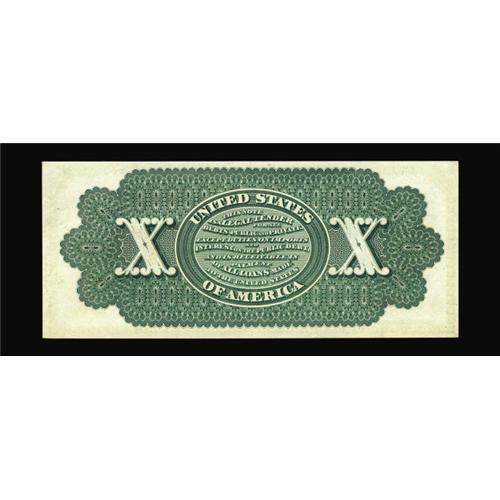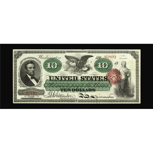 <B>Fr. 95b $10 1863 Legal Tender Gem New.</B></I> Beautifully margined, with spectacular color and great eye appeal. The grade would most likely be Superb were it not for a couple slightly rounded corners. This piece has not been previously reported to the census, though it falls right into a group of notes that have been reported as uncirculated.<BR><I>From The Plymouth Rock Collection</B></I>