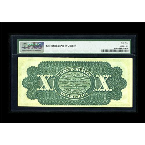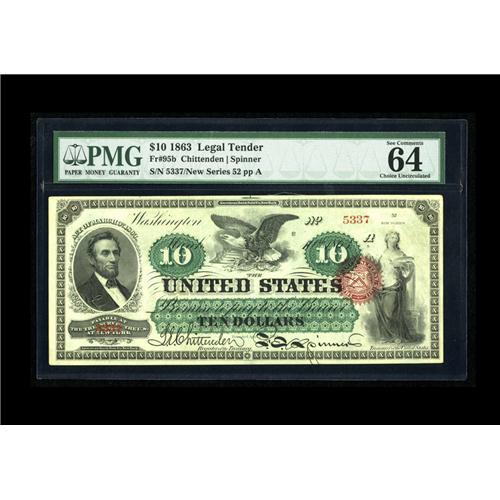 <B>Fr. 95b $10 1863 Legal Tender PMG Choice Uncirculated 64 EPQ.</B></I> A scarce note with all the overall aesthetic appeal of a full Gem, a grade it likely did not achieve due solely to very slight rounding at the corners. The margins are ample all around and the color is every bit as strong as the day this note was originally printed. Overall, a clearly superior example that has earned without question the coveted "EPQ" designation.<BR><BR><b>Shipping:</b> Coin/Currency (<a target="_blank" href="http://www.heritageauctions.com/common/shipping.php">view shipping information</a>)
