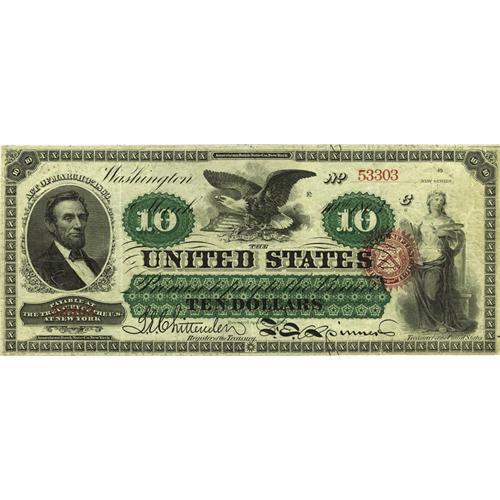 <B>Fr. 95b $10 1863 Legal Tender Very Fine.</B></I> Few Very Fine examples of this issue face up as nicely as this piece, many will even consider it to be Extremely Fine. The paper is original and full of life, and the seal and serial numbers are especially bold.<BR><I>From The Plymouth Rock Collection</B></I>