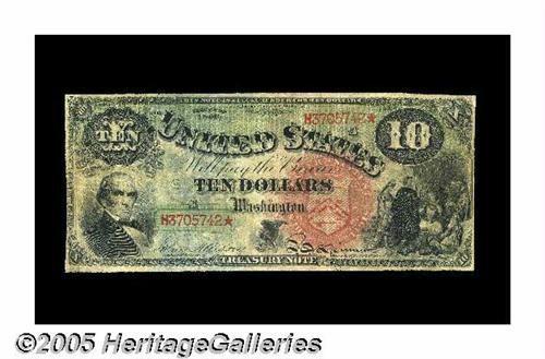 <B>Fr. 96 $10 1869 Legal Tender Fine.</B></I> Crispness remains on this Rainbow $10 that carries pleasing colors and other acceptable mid-grade traits.