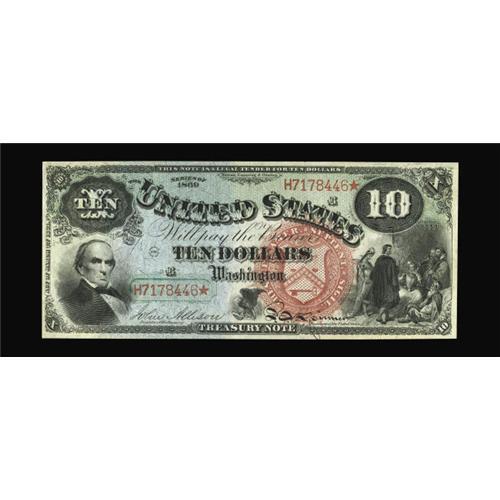 <B>Fr. 96 $10 1869 Legal Tender Gem New.</B></I> The face margins of this vibrant Rainbow $10 are among the nicest we have ever handled. But for the back design being centered a bit low, which is quite typical for this design, we'd have been tempted to assign the Superb grade. This is a truly memorable note. Any collector who has been patiently waiting for a really nice example will want to give serious consideration to this lovely note.