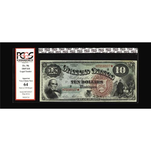 <B>Fr. 96 $10 1869 Legal Tender PCGS Apparent Very Choice New 64.</B></I> This is a nicely centered Rainbow Ten with rich inks and wide margins. The red third-party label states "stain in UR margin." This long ago little accident will save you plenty on this popular design. A hint of a repaired split is also noted in the lower margin.