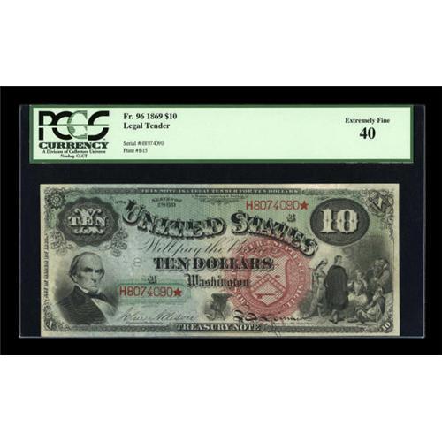 <B>Fr. 96 $10 1869 Legal Tender PCGS Extremely Fine 40.</B></I> A very good looking Rainbow Ten, with terrific color not only for the XF grade, but for any grade at all. The seal color is particularly bold, something not often seen on this type.<BR><BR><b>Shipping:</b> Coins & Currency (<a target="_blank" href="http://www.heritageauctions.com/common/shipping.php">view shipping information</a>)