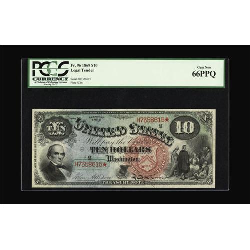 <B>Fr. 96 $10 1869 Legal Tender PCGS Gem New 66PPQ.</B></I> Very nicely centered on both sides, with strong color of the inks, paper and anticounterfeiting tint. One of the nicest Jackasses to be auctioned by us in quite some time.