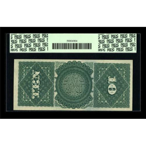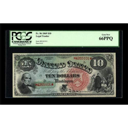 <B>Fr. 96 $10 1869 Legal Tender PCGS Gem New 66PPQ</B></I>. This Rainbow Ten is extremely popular at all grade levels, but it is only truly scarce 65 and higher. This 66PPQ example has incredible color, as well as huge margins and magnetic eye appeal. This Rainbow Ten is well margined all around, a feature that is particularly important on the back of this type, as this is one of the few instances in US Currency where the back design is taller than the face design, causing the great majority of 1869 tens to have part of their back design cut by the margins. In this case, the nearly perfect back centering allows the full design to be well clear of the edge. A premium piece that appears to us as though it would be equally at home in a 67 holder. <BR><BR><b>Shipping:</b> Coins & Currency (<a target="_blank" href="http://www.heritageauctions.com/common/shipping.php">view shipping information</a>)