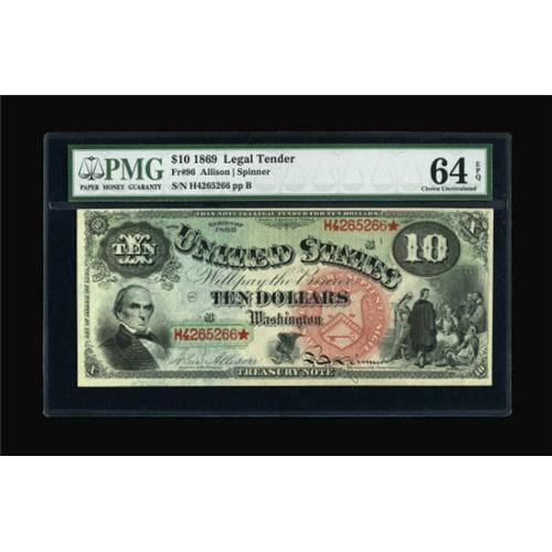<B>Fr. 96 $10 1869 Legal Tender PMG Choice Uncirculated 64 EPQ.</B></I> A wonderfully original Jackass from a known run that has supplied collectors with uncirculated notes for many years. The note has the ink and paper colors that it had the day it was pulled from the press over 135 years ago.<B><BR></B></I><I>From The Warren Marshall Collection</B></I><BR><BR><b>Shipping:</b> Coins & Currency (<a target="_blank" href="http://www.heritageauctions.com/common/shipping.php">view shipping information</a>)