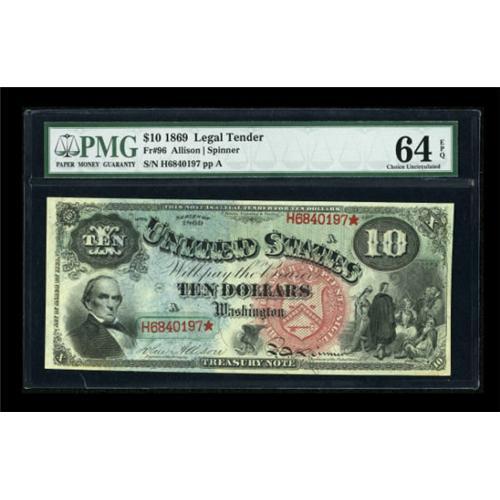 <B>Fr. 96 $10 1869 Legal Tender PMG Choice Uncirculated 64 EPQ.</B></I> The colors on this Rainbow Ten are spectacular, with the paper fully bright and the inks extremely bold. Even the blue security tint is bolder than normally seen. The face centering is less than perfect, but the margins are broad enough at all points to easily support the 64 EPQ grade. A handsome example that falls just a hair short of full Gem.<BR><I>From The John Ameen Collection</B></I><BR><BR><b>Shipping:</b> Coins & Currency (<a target="_blank" href="http://www.heritageauctions.com/common/shipping.php">view shipping information</a>)