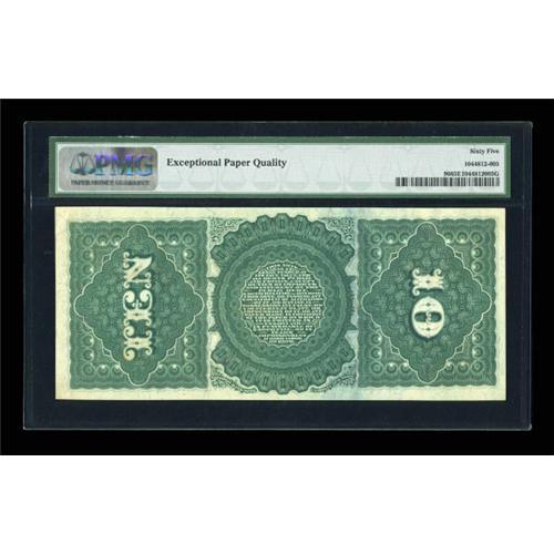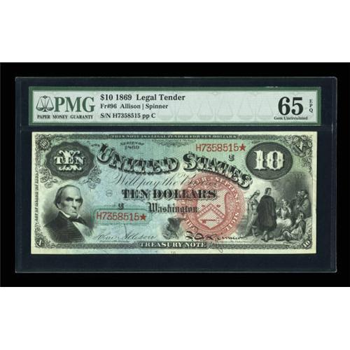 <B>Fr. 96 $10 1869 Legal Tender PMG Gem Uncirculated 65 EPQ.</B></I> A gorgeous Rainbow Ten with far brighter color than the typical example of this type. The seal in particular is a stand-out for color as it is a bold red rather than the normally-seen lighter pink. The green underprint and blue anti-counterfeiting stain are also unusually bold on this well-centered example. This note is an upgrade of the piece featured both sides on page 83 of the Dauer book.<BR><I>From The Dr. Edward & Joanne Dauer Collection</B></I><BR><BR><b>Shipping:</b> Coins & Currency (<a target="_blank" href="http://www.heritageauctions.com/common/shipping.php">view shipping information</a>)