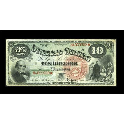 <B>Fr. 96 $10 1869 Legal Tender Very Fine.</B></I> This crispy example has eluded the census dragnet. Despite being a touch flat the colors still radiate from the surface. A few pinholes are seen at center.