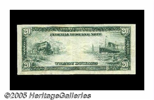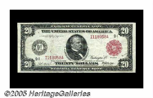 <B>Fr. 960a $20 1914 Red Seal Federal Reserve Note Very Fine.</B></I> Fewer than 20 of both varieties of Minneapolis $20 Red Seals are known. This healthy mid-grade note has bright paper and a dark red overprint, while an errant black ink mark is noticed to the left of the Treasury seal. The edges are also sound on this "a" example that is characterized by the lack of a small district designation in the lower right-hand corner. Opportunities such as this must be taken care of when presented.