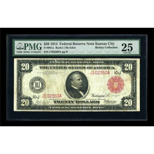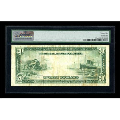 <B>Fr. 961a $20 1914 Red Seal Federal Reserve Note PMG Very Fine 25.</B></I> A mere 20 examples of this issue are known to the collecting fraternity. This piece is a pleasing, problem-free example with a bright red seal and serial numbers. Only two examples of this number that PMG has graded have received higher grades than this note.<BR><BR><b>Shipping:</b> Coins & Currency (<a target="_blank" href="http://www.heritageauctions.com/common/shipping.php">view shipping information</a>)
