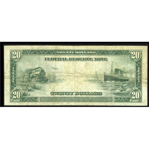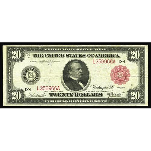 <B>Fr. 963b $20 1914 Red Seal Federal Reserve Note Very Fine.</B></I> This newcomer brings the total to seven notes in the Gengerke census with two impounded in Federal institutions. This note should see some spirited bidding tonight as the originality is all there.