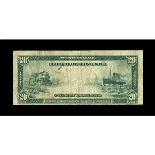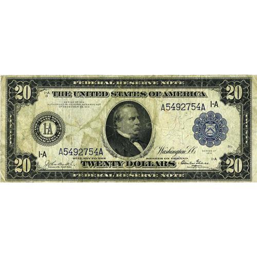 <B>Fr. 965 $20 1914 Federal Reserve Note Very Good-Fine.</B></I> The current census stood at ten until the discovery of this piece recently. With the popularity of blue seals rising sharply, expect current supplies to be exhausted. Nice centering and bright color still grace this tough Boston double Sawbuck.
