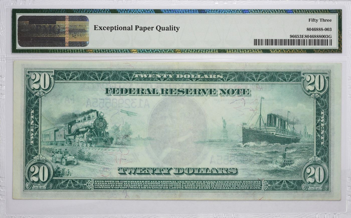 Fr, 966. 1914 $20 Federal Reserve Note. Blue Seal. Boston. PMG About Uncirculated 53 EPQ. Only a single note has been graded in the entire Uncirculated grade range in the PMG population report leaving attractive lightly circulated notes such as this offering the collecting norm. Strong original paper throughout is observed and sharp design detail as well.