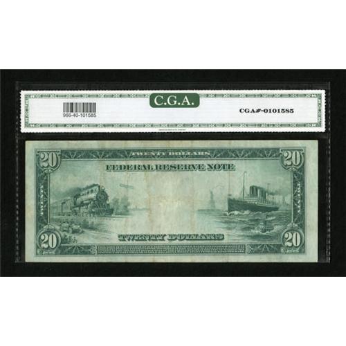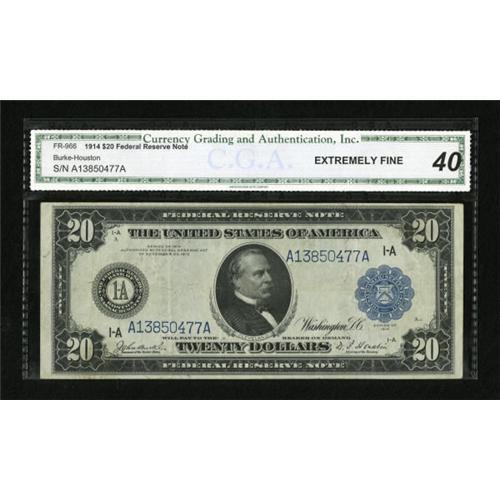 <B>Fr. 966 $20 1914 Federal Reserve Note CGA Extremely Fine 40.</B></I> A number of folds and some light handling account for the grade. This piece features the less often seen Burke-Houston signature combination.<BR><BR><b>Shipping:</b> Coins & Currency (<a target="_blank" href="http://www.heritageauctions.com/common/shipping.php">view shipping information</a>)