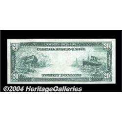 Fr. 966 $20 1914 Federal Reserve Note Choice New. This is the fifth example of this number that CAA has sold. The total census is about two dozen. <BR><BR><B>Important notice:</B> Heritage usually auctions material at the rate of 200-250 lots per hour. On some occasions eBay Live bid software or the Internet may not be able to keep up with the pace of the auction. We recommend placing a realistic absentee bid now as insurance to avoid disappointment. Occasionally the auctioneer may eliminate or reject an eBay Live bid, and the auctioneer may also reopen a lot after the close of the eBay live bidding (usually because we missed an audience bid), and may reject your bid even if it shows you as the winning bidder. By bidding via eBay Live, you agree that Heritage may award the lot to another bidder at its sole discretion under the circumstances described above or any other reasonable circumstances. Since eBay bids are not shown to us until we open the lot on the floor, we treat those bids just like floor bids. In most cases the floor responds before the eBay bid is presented to us, due to Internet lag time, so for consistency we have made it a policy that floor bids are always considered first over tie eBay live bids. Also please note that all Heritage lots purchased through eBay Live carry a 20% Buyer's Premium. Please make sure you read the Terms and Conditions before you bid. <BR><BR><B>IMPORTANT ANNOUNCEMENT ABOUT RESERVES:</B> Heritage now divulges all reserves on its web site 7 days before every auction. If you want to know whether the reserve on this lot has been met, and if not, what the reserve amount is, please visit this lot page on the HeritageCoin.com web site, or email: bid@HeritageGalleries.com