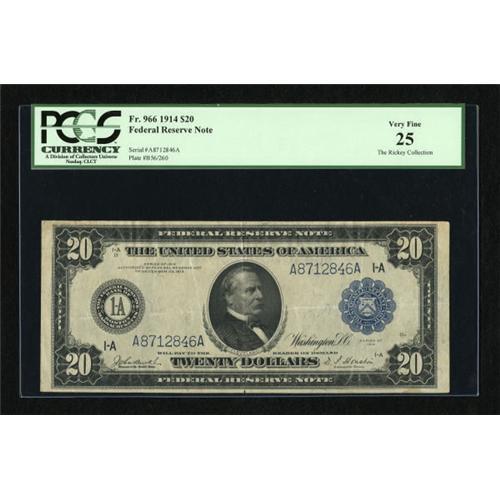 <B>Fr. 966 $20 1914 Federal Reserve Note PCGS Very Fine 25.</B></I> A Burke-Houston issue with solid margins and appealing paper.<BR><BR><b>Shipping:</b> Coins & Currency (<a target="_blank" href="http://www.heritageauctions.com/common/shipping.php">view shipping information</a>)