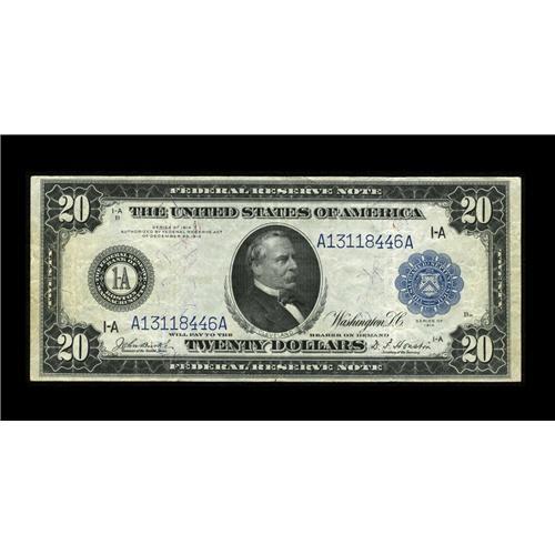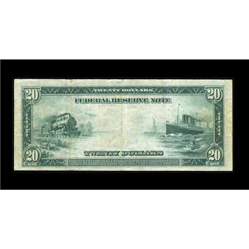 <B>Fr. 966 $20 1914 Federal Reserve Note Very Fine.</B></I> Natural paper surfaces and embossing are noticed.<BR><I>From The Plymouth Rock Collection</B></I>