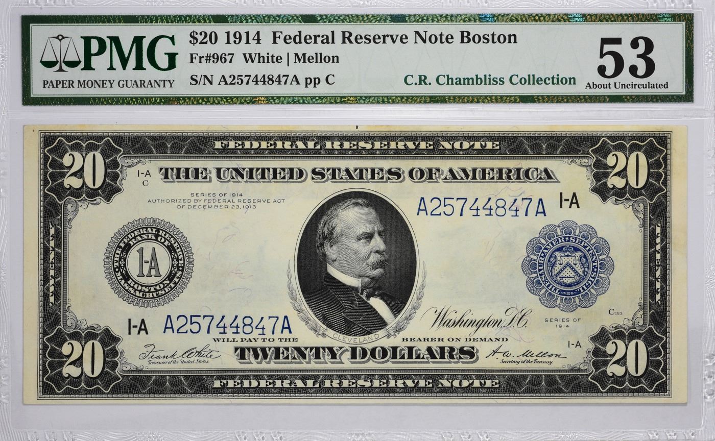 Fr. 967. 1914 $20 Federal Reserve Note. Blue Seal. Boston. PMG About Uncirculated 53. Just light circulation on this Boston $20 Federal Reserve note.