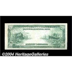 Fr. 967 $20 1914 Federal Reserve Note About New. The margins and paper originality are terrific, but the note has a light center fold and a few tiny rust spots. A scarce piece, with about two dozen examples known. <BR><BR><B>Important notice:</B> Heritage usually auctions material at the rate of 200-250 lots per hour. On some occasions eBay Live bid software or the Internet may not be able to keep up with the pace of the auction. We recommend placing a realistic absentee bid now as insurance to avoid disappointment. Occasionally the auctioneer may eliminate or reject an eBay Live bid, and the auctioneer may also reopen a lot after the close of the eBay live bidding (usually because we missed an audience bid), and may reject your bid even if it shows you as the winning bidder. By bidding via eBay Live, you agree that Heritage may award the lot to another bidder at its sole discretion under the circumstances described above or any other reasonable circumstances. Since eBay bids are not shown to us until we open the lot on the floor, we treat those bids just like floor bids. In most cases the floor responds before the eBay bid is presented to us, due to Internet lag time, so for consistency we have made it a policy that floor bids are always considered first over tie eBay live bids. Also please note that all Heritage lots purchased through eBay Live carry a 20% Buyer's Premium. Please make sure you read the Terms and Conditions before you bid. <BR><BR><B>IMPORTANT ANNOUNCEMENT ABOUT RESERVES:</B> Heritage now divulges all reserves on its web site 7 days before every auction. If you want to know whether the reserve on this lot has been met, and if not, what the reserve amount is, please visit this lot page on the HeritageCoin.com web site, or email: bid@HeritageGalleries.com