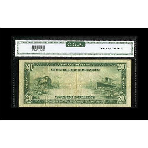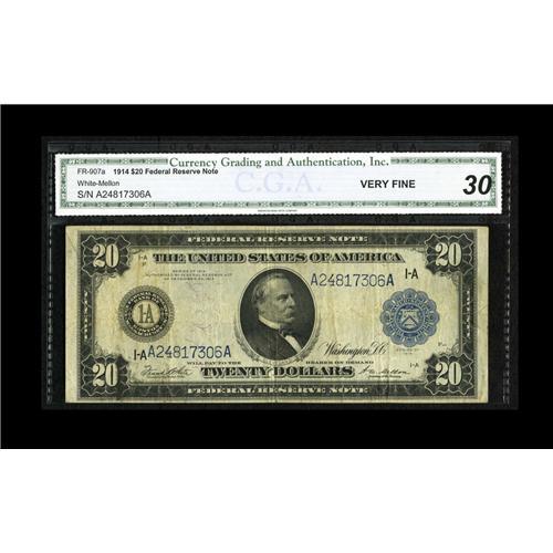 <B>Fr. 967 $20 1914 Federal Reserve Note CGA Very Fine 30.</B></I> The holder incorrectly identifies the Friedberg number. The margins are complete and the paper fully intact.