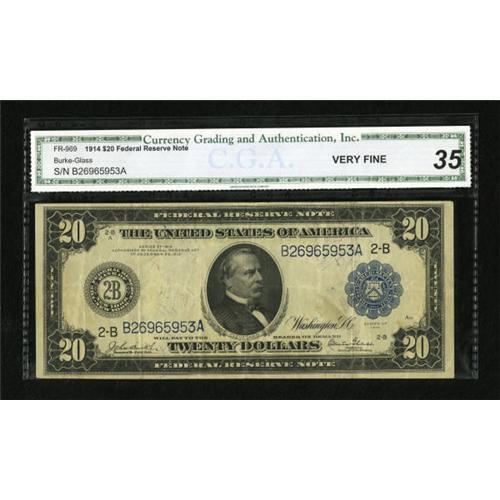<B>Fr. 969 $20 1914 Federal Reserve Note CGA Very Fine 35.</B></I> A moderately circulated piece with some toning of the paper.<BR><BR><b>Shipping:</b> Coins & Currency (<a target="_blank" href="http://www.heritageauctions.com/common/shipping.php">view shipping information</a>)