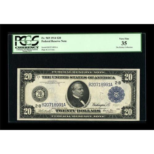 <B>Fr. 969 $20 1914 Federal Reserve Note PCGS Very Fine 35.</B></I> This is an eye appealing New York FRN carrying the elusive Burke/Glass signature combination.<BR><BR><b>Shipping:</b> Coins & Currency (<a target="_blank" href="http://www.heritageauctions.com/common/shipping.php">view shipping information</a>)