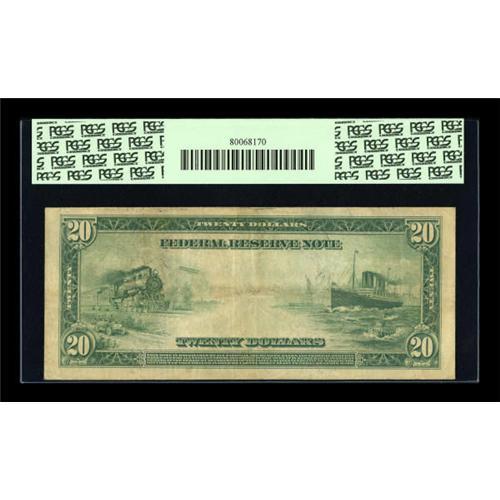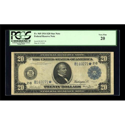 <B>Fr. 969 $20 1914 Federal Reserve Star Note PCGS Very Fine 20.</B></I> This is one of five known Burke-Glass New York district $20 stars. It was obtained from our January, 2005 FUN sale, where it fetched $2530. Expect it to bring no less, and quite probably more, by the time the hammer falls this evening. <BR><I>From The Lawrence O'Neal Collection</B></I><BR><BR><b>Shipping:</b> Coins & Currency (<a target="_blank" href="http://www.heritageauctions.com/common/shipping.php">view shipping information</a>)
