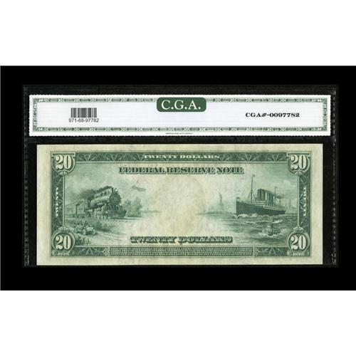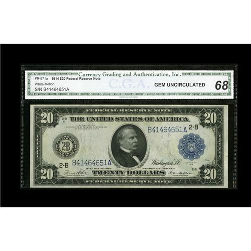 <B>Fr. 971a $20 1914 Federal Reserve Note CGA Gem Uncirculated 68.</B></I> This is a vivid note saved for posterity at a lofty level.