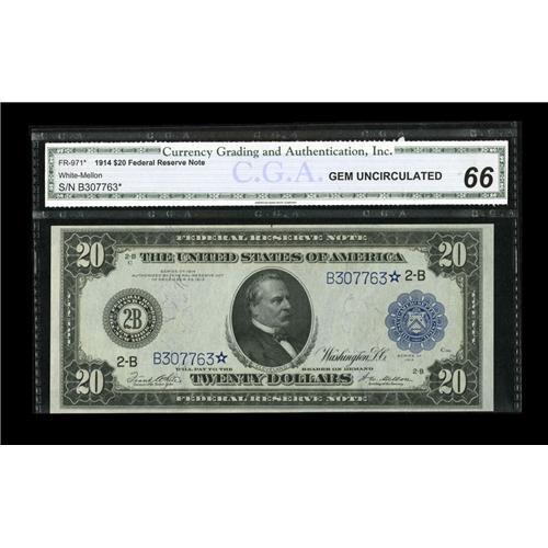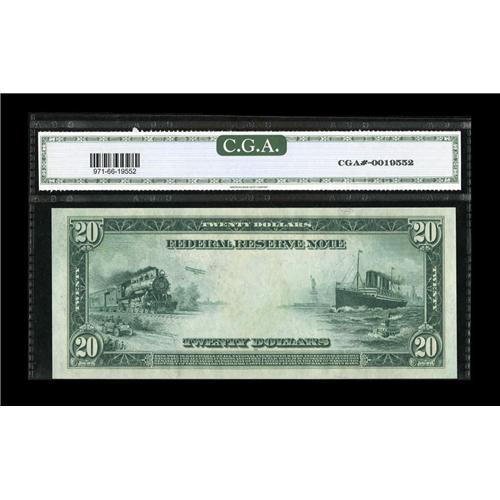 <B>Fr. 971a $20 1914 Federal Reserve Note Star CGA Gem Uncirculated 66.</B></I> About a dozen examples are known of this New York District $20 Star, including this note, which is one of a group of four known uncirculated pieces. All the remaining 971a Stars grade Fine or lower. This note certainly appears to be the high-end Gem that CGA has assigned.