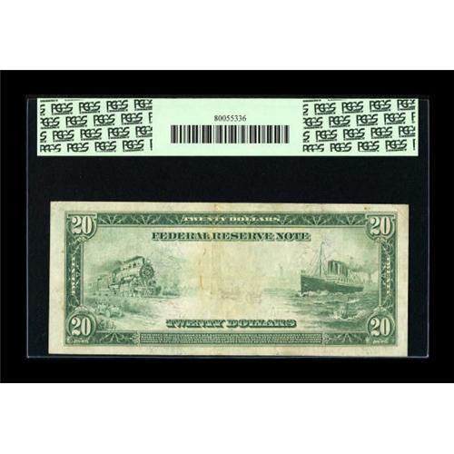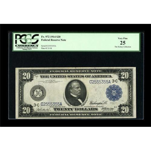 <B>Fr. 972 $20 1914 Federal Reserve Note PCGS Very Fine 25.</B></I> A quintuplet of fives are seen in this seven digit serial number. <BR><BR><b>Shipping:</b> Coins & Currency (<a target="_blank" href="http://www.heritageauctions.com/common/shipping.php">view shipping information</a>)