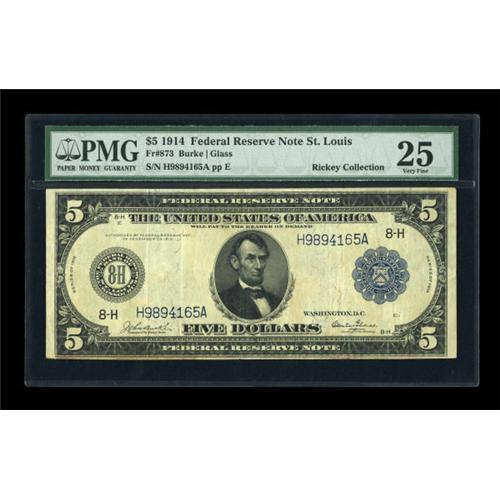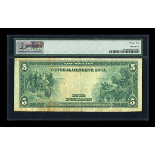 <B>Fr. 873 $5 1914 Federal Reserve Note PMG Very Fine 25.</B></I> This issue was rarely encountered until a group of about 10 notes was discovered in 2003. Still, the number known is less than 30 pieces.<BR><BR><b>Shipping:</b> Coins & Currency (<a target="_blank" href="http://www.heritageauctions.com/common/shipping.php">view shipping information</a>)