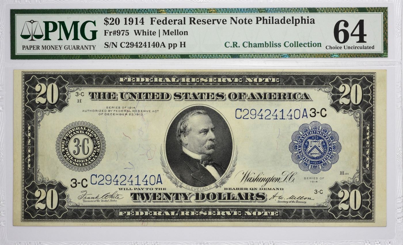 Fr. 975. 1914 $20 Federal Reserve Note. Blue Seal. Philadelphia. PMG Choice Uncirculated 64. This near Gem Philadelphia offering will certainly appeal to collectors. Always a design that cannot be offered enough at these grade levels.