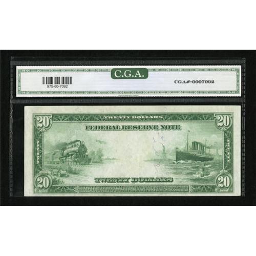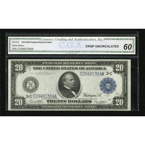 <B>Fr. 975 $20 1914 Federal Reserve Note CGA Crisp Uncirculated 60.</B></I> A well-margined Philadelphia Twenty<BR><BR><b>Shipping:</b> Coins & Currency (<a target="_blank" href="http://www.heritageauctions.com/common/shipping.php">view shipping information</a>)