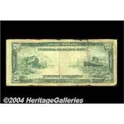 Fr. 976 $20 1914 Federal Reserve Note Fine. This is only the fifth example of this number that we've handled. The body of the note grades fully Fine, but the edges have some nicks and small pieces missing, lowering the value to that of a VG. <BR><BR><B>Important notice:</B> Heritage usually auctions material at the rate of 200-250 lots per hour. On some occasions eBay Live bid software or the Internet may not be able to keep up with the pace of the auction. We recommend placing a realistic absentee bid now as insurance to avoid disappointment. Occasionally the auctioneer may eliminate or reject an eBay Live bid, and the auctioneer may also reopen a lot after the close of the eBay live bidding (usually because we missed an audience bid), and may reject your bid even if it shows you as the winning bidder. By bidding via eBay Live, you agree that Heritage may award the lot to another bidder at its sole discretion under the circumstances described above or any other reasonable circumstances. Since eBay bids are not shown to us until we open the lot on the floor, we treat those bids just like floor bids. In most cases the floor responds before the eBay bid is presented to us, due to Internet lag time, so for consistency we have made it a policy that floor bids are always considered first over tie eBay live bids. Also please note that all Heritage lots purchased through eBay Live carry a 20% Buyer's Premium. Please make sure you read the Terms and Conditions before you bid. <BR><BR><B>IMPORTANT ANNOUNCEMENT ABOUT RESERVES:</B> Heritage now divulges all reserves on its web site 7 days before every auction. If you want to know whether the reserve on this lot has been met, and if not, what the reserve amount is, please visit this lot page on the HeritageCoin.com web site, or email: bid@HeritageGalleries.com