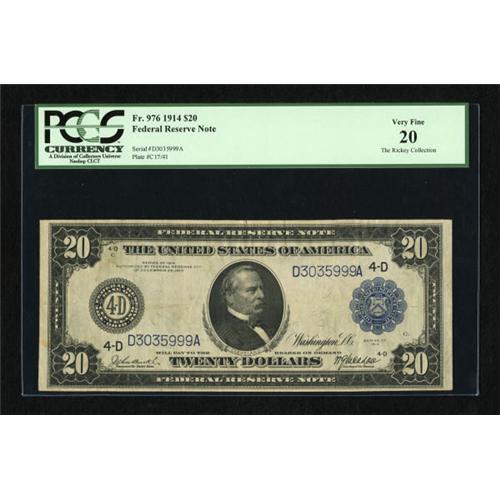 <B>Fr. 976 $20 1914 Federal Reserve Note PCGS Very Fine 20.</B></I> The paper is solid on this Cleveland Burke-McAdoo $20.<BR><BR><b>Shipping:</b> Coins & Currency (<a target="_blank" href="http://www.heritageauctions.com/common/shipping.php">view shipping information</a>)