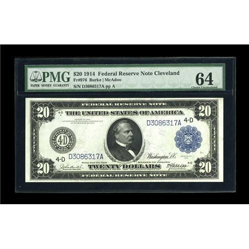 <B>Fr. 976 $20 1914 Federal Reserve Note PMG Choice Uncirculated 64.</B></I> A somewhat scarcer Fed number.<BR><BR><b>Shipping:</b> Coins & Currency (<a target="_blank" href="http://www.heritageauctions.com/common/shipping.php">view shipping information</a>)