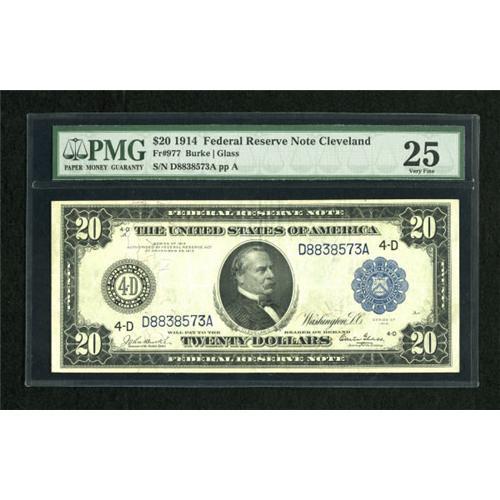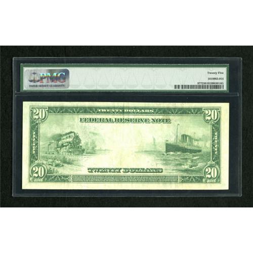 <B>Fr. 977 $20 1914 Federal Reserve Note PMG Very Fine 25.</B></I> The paper is exceptionally appealing for the grade with boldly printed details and a deep overprint.<BR><BR><b>Shipping:</b> Coins & Currency (<a target="_blank" href="http://www.heritageauctions.com/common/shipping.php">view shipping information</a>)