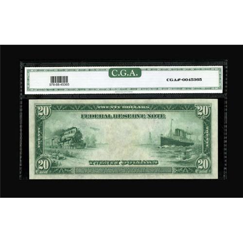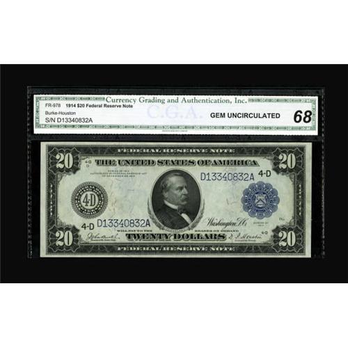 <B>Fr. 978 $20 1914 Federal Reserve Note CGA Gem Uncirculated 68.</B></I> Around 75 pieces are known of this Cleveland District Burke-Houston signature combination, but few if any of them can rival this note for quality. It appears to have earned its high third-party 68 grade. <BR><BR><BR><b>Shipping:</b> Coins & Currency (<a target="_blank" href="http://www.heritageauctions.com/common/shipping.php">view shipping information</a>)