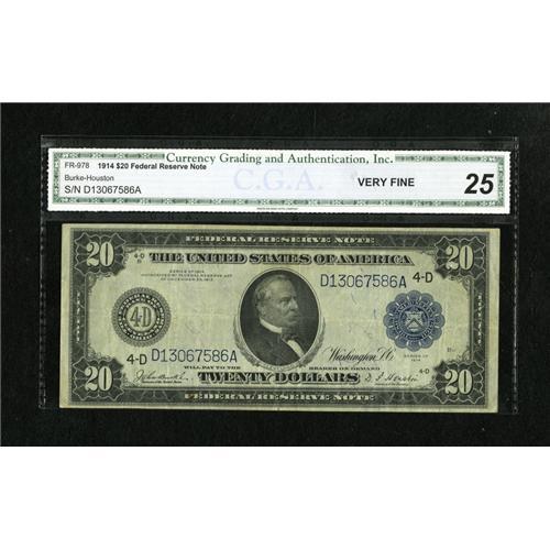 <B>Fr. 978 $20 1914 Federal Reserve Note CGA Very Fine 25.</B></I> An attractive mid-grade representative of this issue. The paper is solid.<BR><BR><b>Shipping:</b> Coins & Currency (<a target="_blank" href="http://www.heritageauctions.com/common/shipping.php">view shipping information</a>)