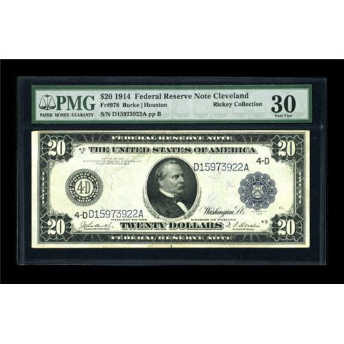 <B>Fr. 978 $20 1914 Federal Reserve Note PMG Very Fine 30.</B></I> A nice representative from this district carrying the signature combination of Burke/Houston.<BR><BR><b>Shipping:</b> Coins & Currency (<a target="_blank" href="http://www.heritageauctions.com/common/shipping.php">view shipping information</a>)