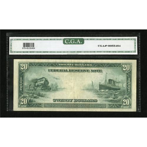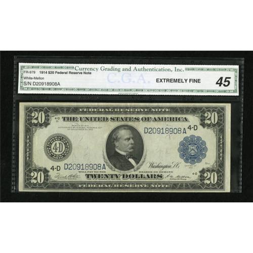 <B>Fr. 979a $20 1914 Federal Reserve Note CGA Extremely Fine 45.</B></I> Solid margins are noted on this lightly circulated $20.<BR><BR><b>Shipping:</b> Coins & Currency (<a target="_blank" href="http://www.heritageauctions.com/common/shipping.php">view shipping information</a>)
