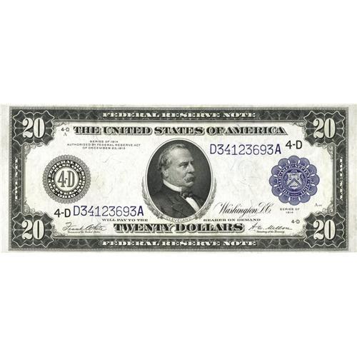 <B>Fr. 979a $20 1914 Federal Reserve Note New.</B></I> Not a rare note, but a lovely "type" example, with excellent centering of both sides, bright colors and lots of eye appeal. Simply a bit too much handling to grade it any higher.
