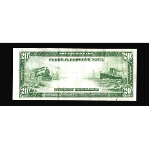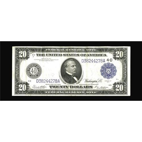 <B>Fr. 979b $20 1914 Federal Reserve Note Very Fine.</B></I> Natural paper surfaces and healthy edges are two merits of this better number that has only two dozen serial numbers in the census.