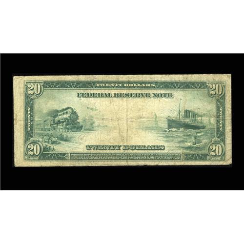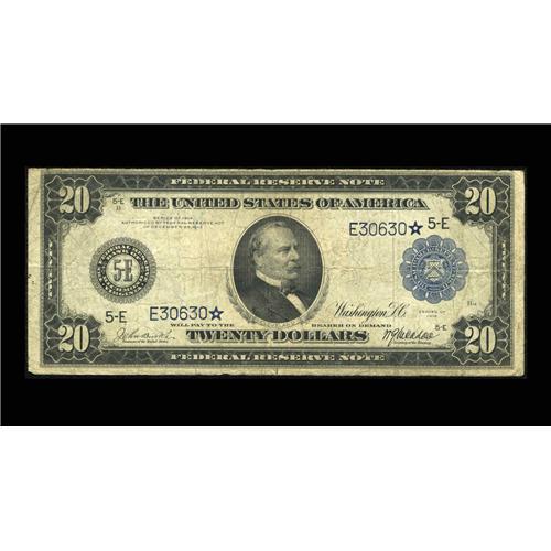 <B>Fr. 980 $20 1914 Federal Reserve Note Star Fine.</B></I> This is an excessively rare star number where the census lists two pieces known. This example, however, is the only one which has ever been available to collectors, with Richard Merlau having obtained it at the Conklin collection sale back in October of 1995. Expect to see some stiff competiton before the hammer falls on this rare star note tonight.<BR><I>From the Large Size Star Note Collection of Richard Merlau</B></I>